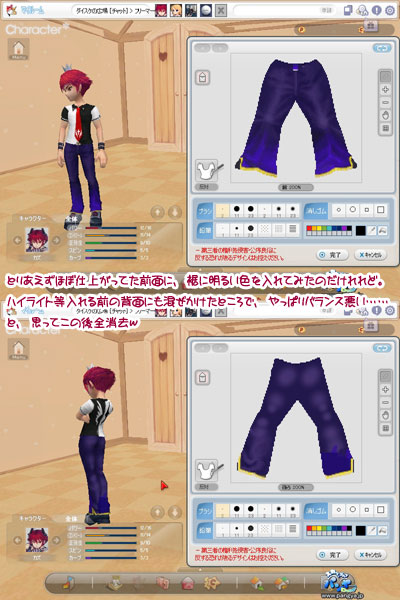 とりあえず、前面の陰影入れが完成してた時点で、上記の思いつきをしたので、前面の裾に明るい色を入れてみた。