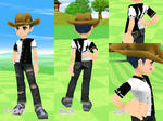 ブルージーンズに、黒い皮のチャプスという重ね穿きスタイル。